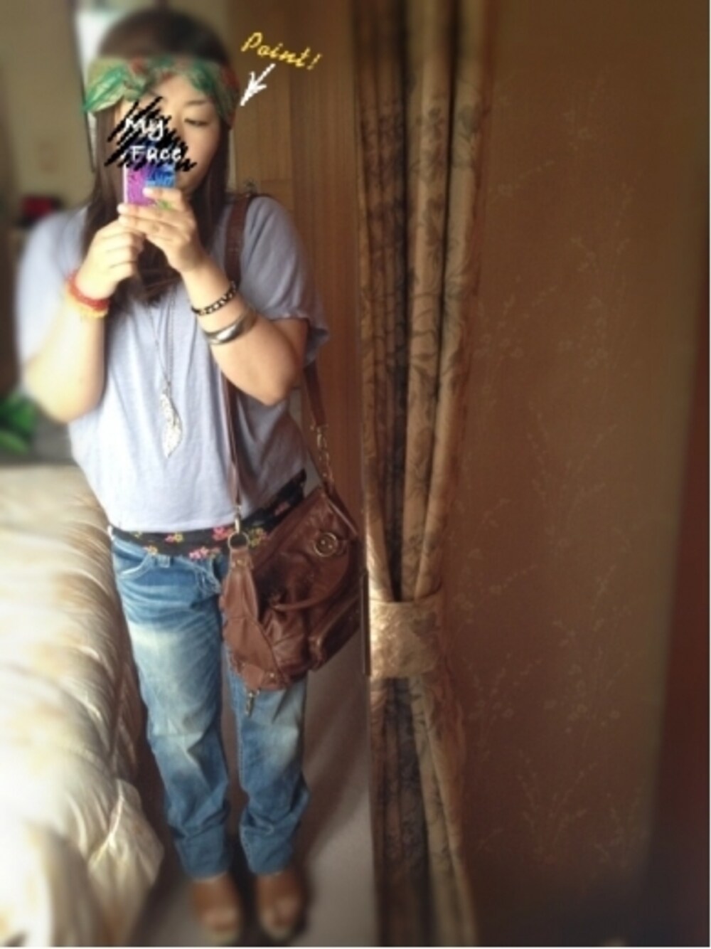 スカーフコーデ ① これはかなりの冒険したスカーフコーデ。 服装は普通だけど。 もちろんお家の中で試しただけです。 母のスカーフ勝手に借りてます 笑 これは有り?それとも無し⁇