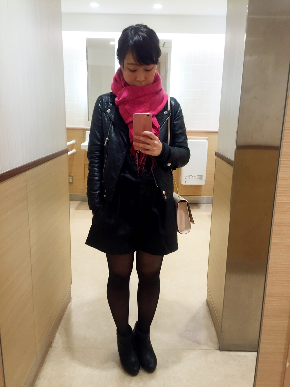 レザージャケットにレザーショートパンツの黒づくめでございます。