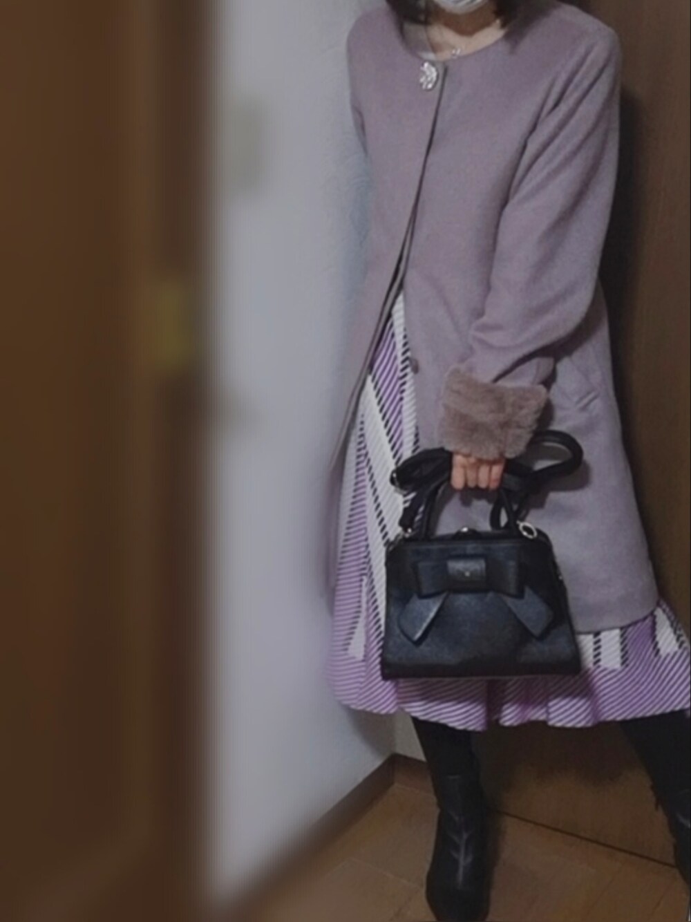 晴れ 最低気温2℃ お出かけだったのでキレイめを心がけてみた ワンピースもコートもくすみ色してるから相性がいいみたい ワンピースはフレアなのでコートは上3つだけとめて、スカート部分の広がりにあわせてみた