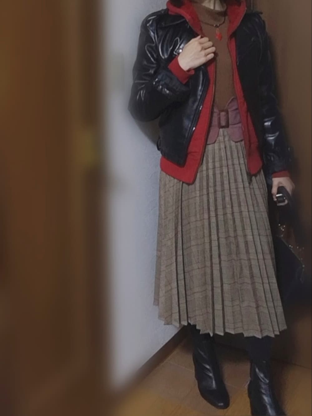 曇り 最低気温3℃ ウェーブ的に固そうなレザーは似合わないらしい でもレザージャケット好き ライダースの形も好き スカートとヒールであわせて女性らしさをプラスして得意な要素をいれて少しでもマシになるようにしてみた
