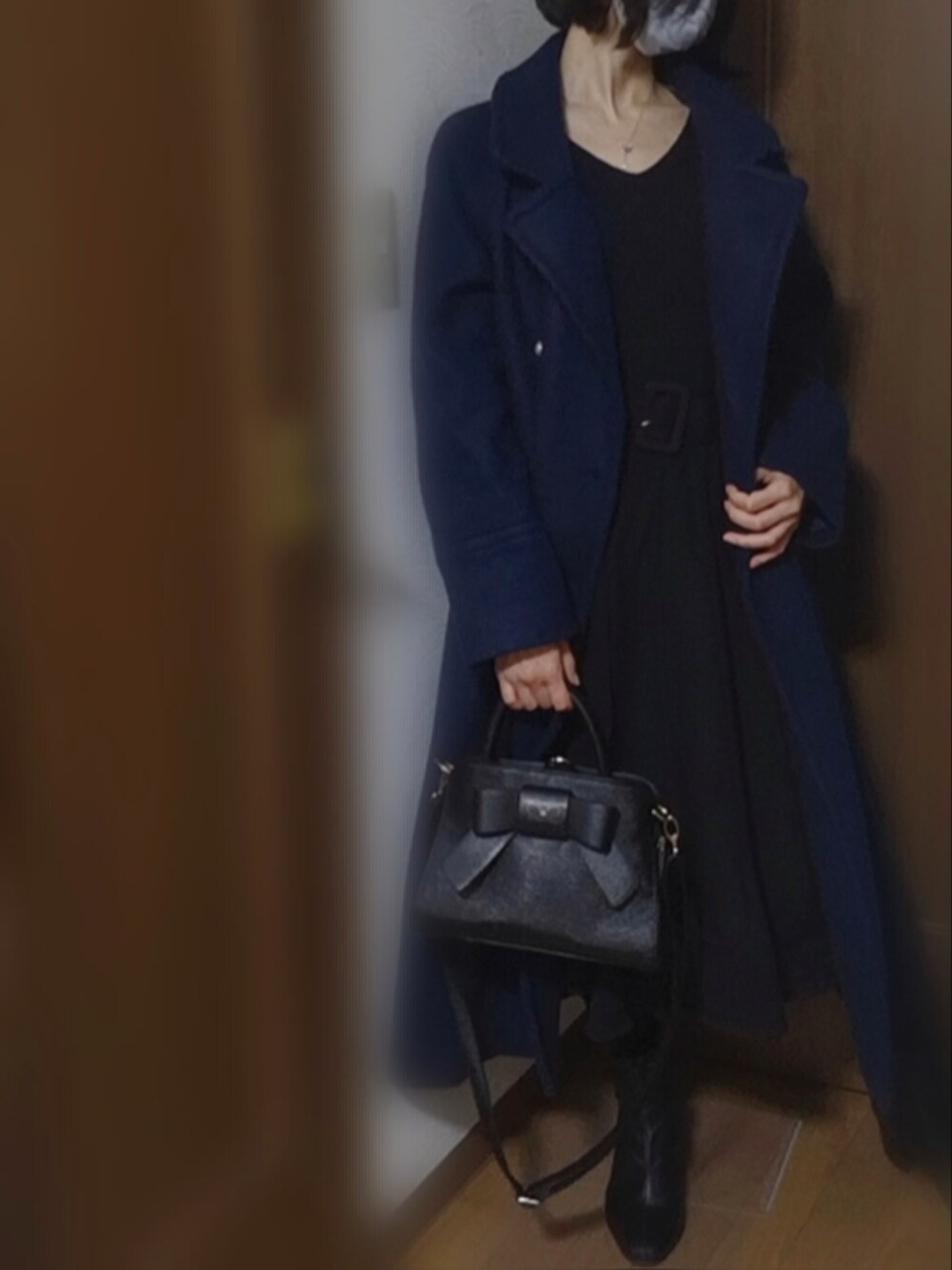 曇り 最低気温4℃ いいところへお出かけ ネイビーと黒で上品で落ち着いた大人な女性をイメージ 首が寂しかったからネックレス重ねづけしてもよかったかも