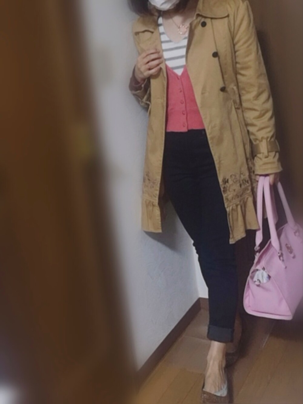 晴れ 最低気温14℃ 一番春らしくできたコーデでは?! ボーダーやショート丈でトレンドも取り入れつつ ピンク色とトレンチコートで春らしく