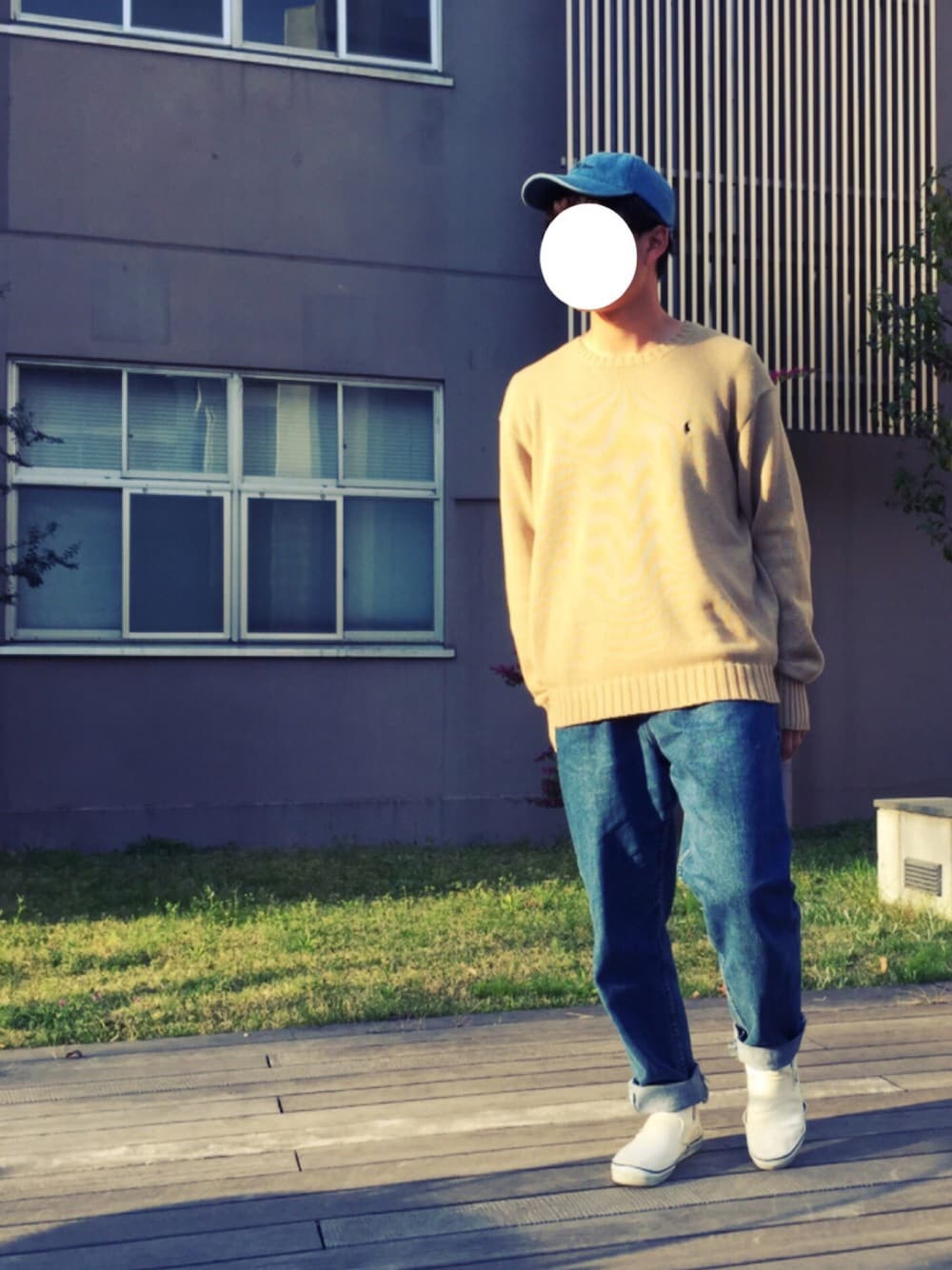 今日は古着シンプルコーデ 春らしく、あえてカラーオンカラーにしました! この肩の落ちたゆるいニット! 1枚で主役になります! すごいお気に入りです!