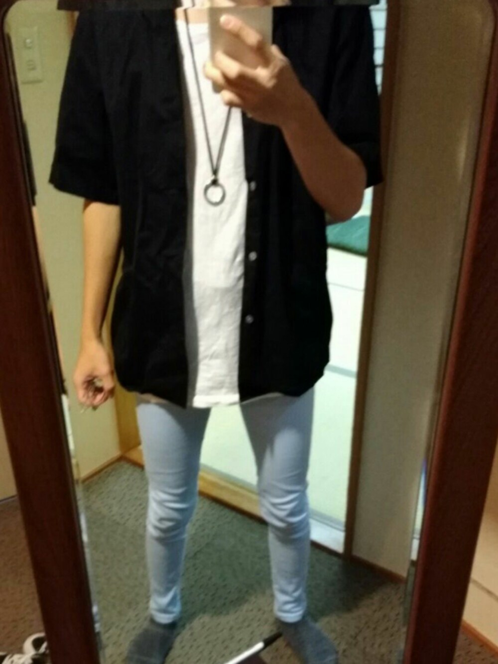 黒白にアースカラーのブルーを着て個性を出してみました。 パンツもスキニーなのでVシルエットが完成していると思います。