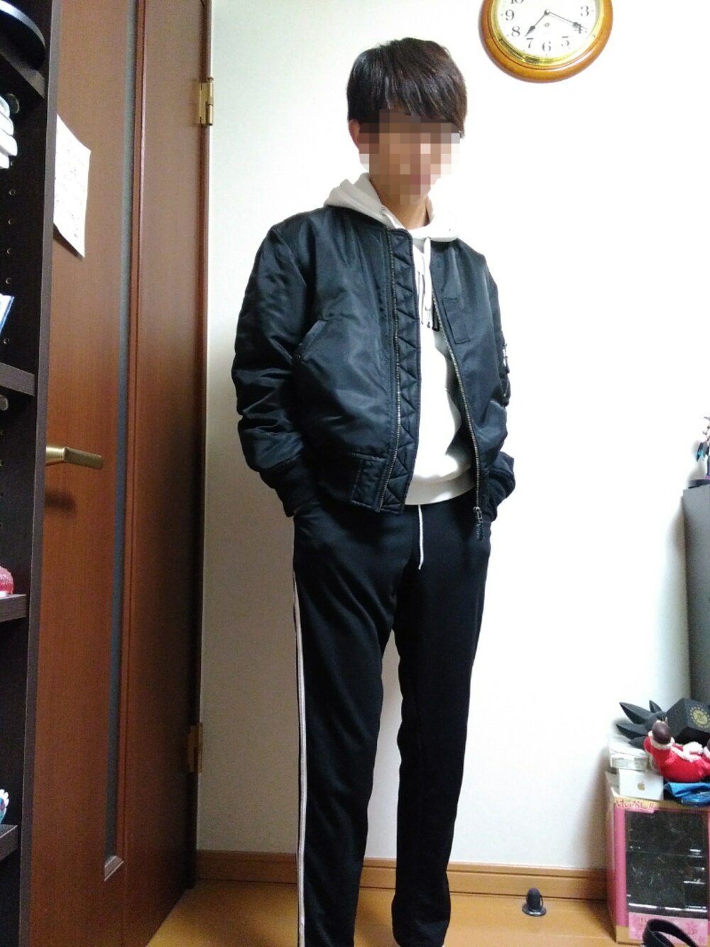 冬と言ってもいいくらいの今日の寒さ。そんなことで今回はパーカーにMA_1を羽織り、さらにラインパンツでよりストリート感が強い着こなしをしてみました。黒白で落ち着いた雰囲気も出しつつパーカーのゆったり感と調和しちょうど良くなると思います!