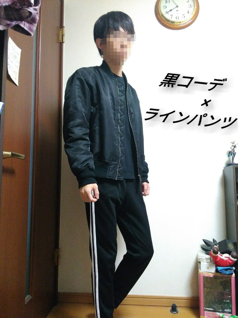 黒コーデとラインパンツを合わせたコーデです。全身が黒で統一されているため、白のラインが目立ち、脚長効果を生み出します。MA_1とラインパンツの組み合わせは抜群なのでインナーにニットであったり、パーカーを合わせるのも良いと思います!!