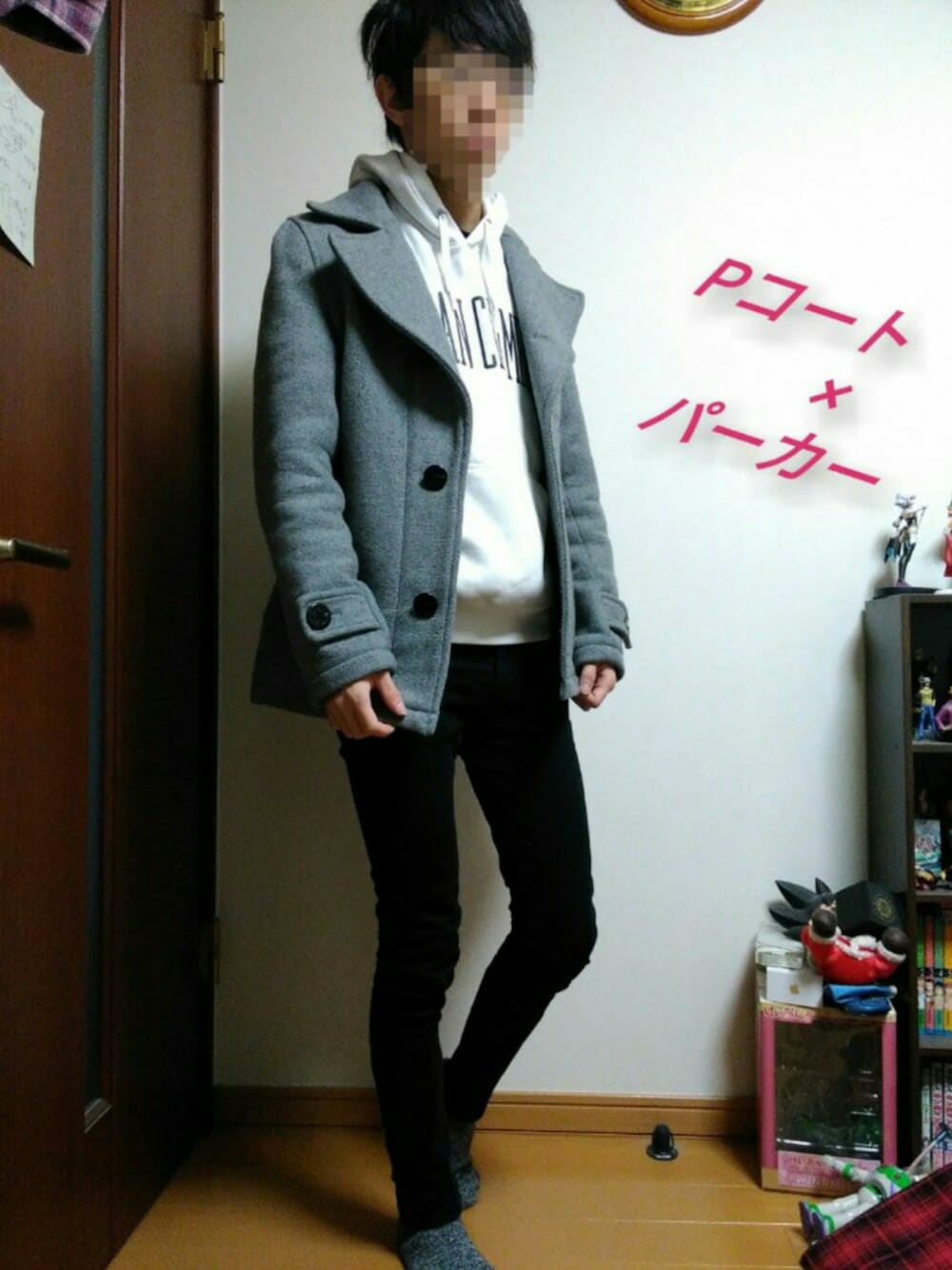 Pコートに白パーカーを合わせてみました。グレーと白なので清潔感があり、黒スキニーでVシルエットも出来るので見た目もかっこよくきまります!