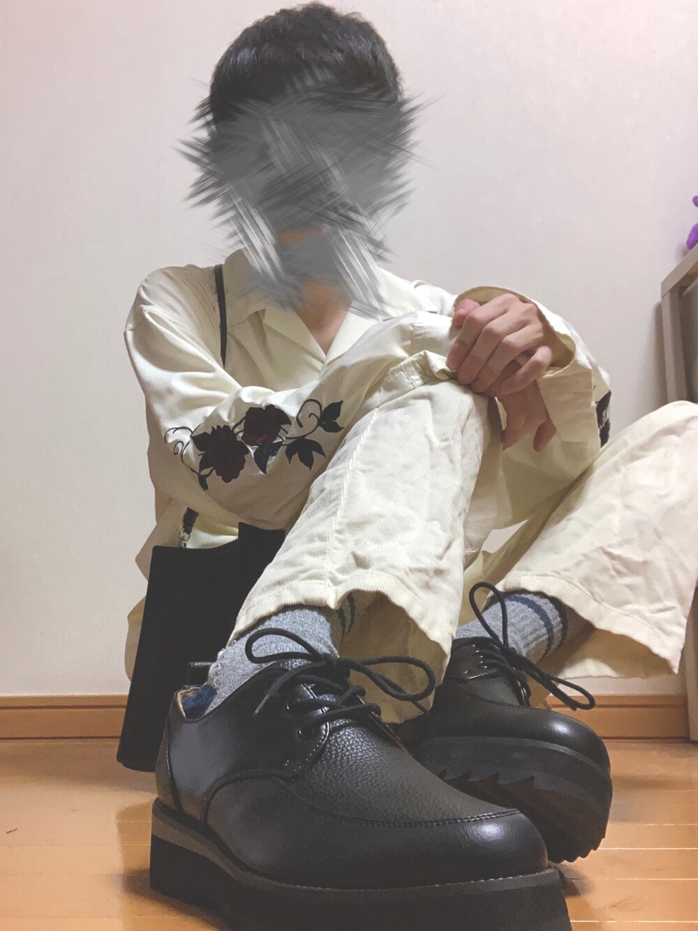 上下ホワイトコーデを組んでみました! パンツはGUのコーデュロイシェフパンツでお手頃な価格で購入できました! ホワイトコーデの柔らかさに加え、バラの刺繍や黒のバックと革靴で男らしさも感じられると思います笑
