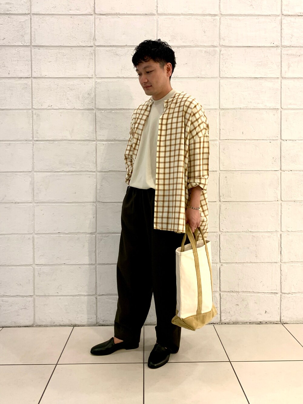 少し秋の空気も感じられる色でコーディネートしました! GALLEGO DESPORTESのシャツはゆったりとして軽い着心地なので、 晩夏の羽織りにもおススメですよ!