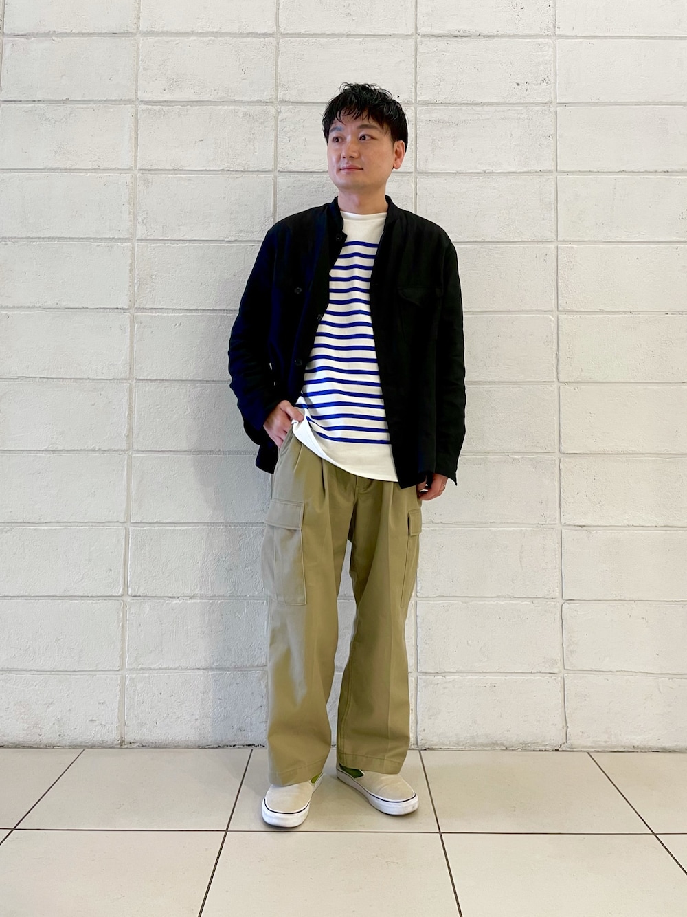 春らしいマリンボーダーをブラックジャケットでキリッと大人なスタイリングに。