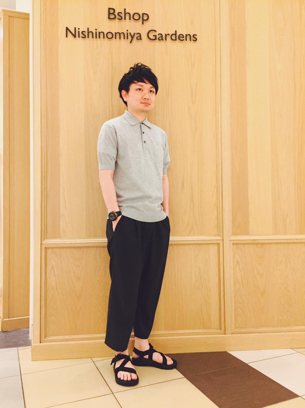 グレーのワントーンコーデです。人気のワイドスラックスとサンダルでラフにまとめました! morris&sonsのポロシャツはコットンニットでサラッとした着心地なので夏でも涼しく着られます!