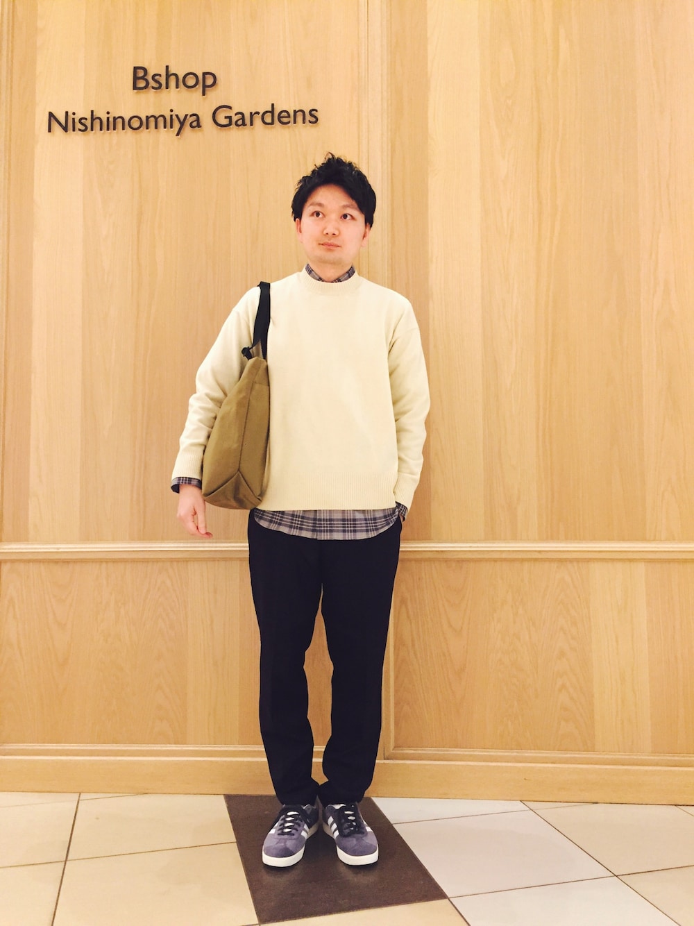 ゆったりしたニットに合わせ、レイヤードのシャツとパンツのサイズもワンサイズアップしたリラックス感のあるコーディネートにしました。ニットはとても柔らかく、着心地抜群です!