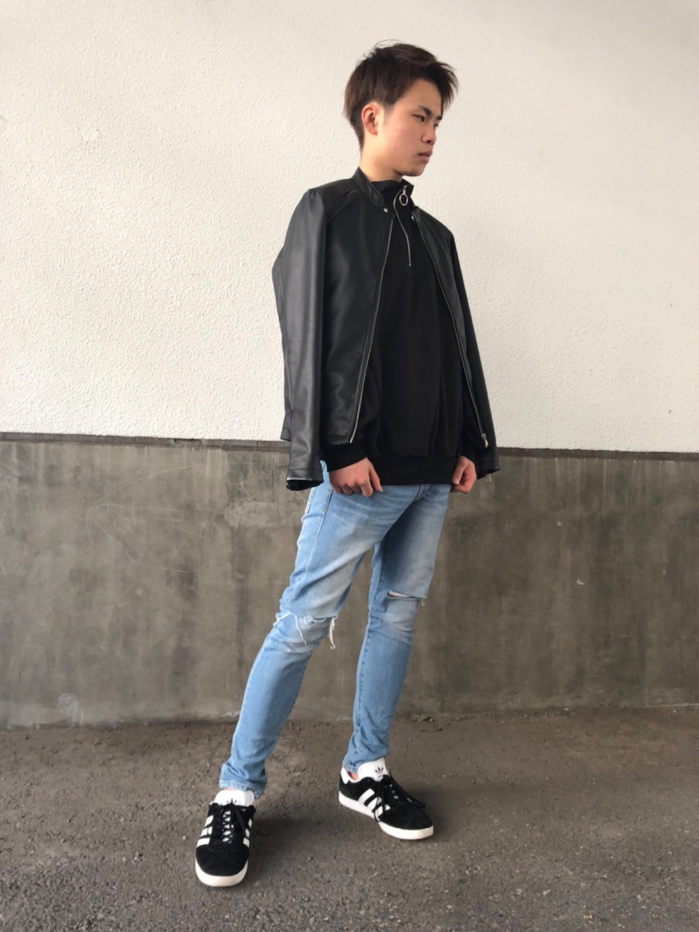 まーくんのライダースジャケット「リアルタッチ スムース / スエード 合成皮革 シングル ライダース ジャケット」を使ったコーディネート