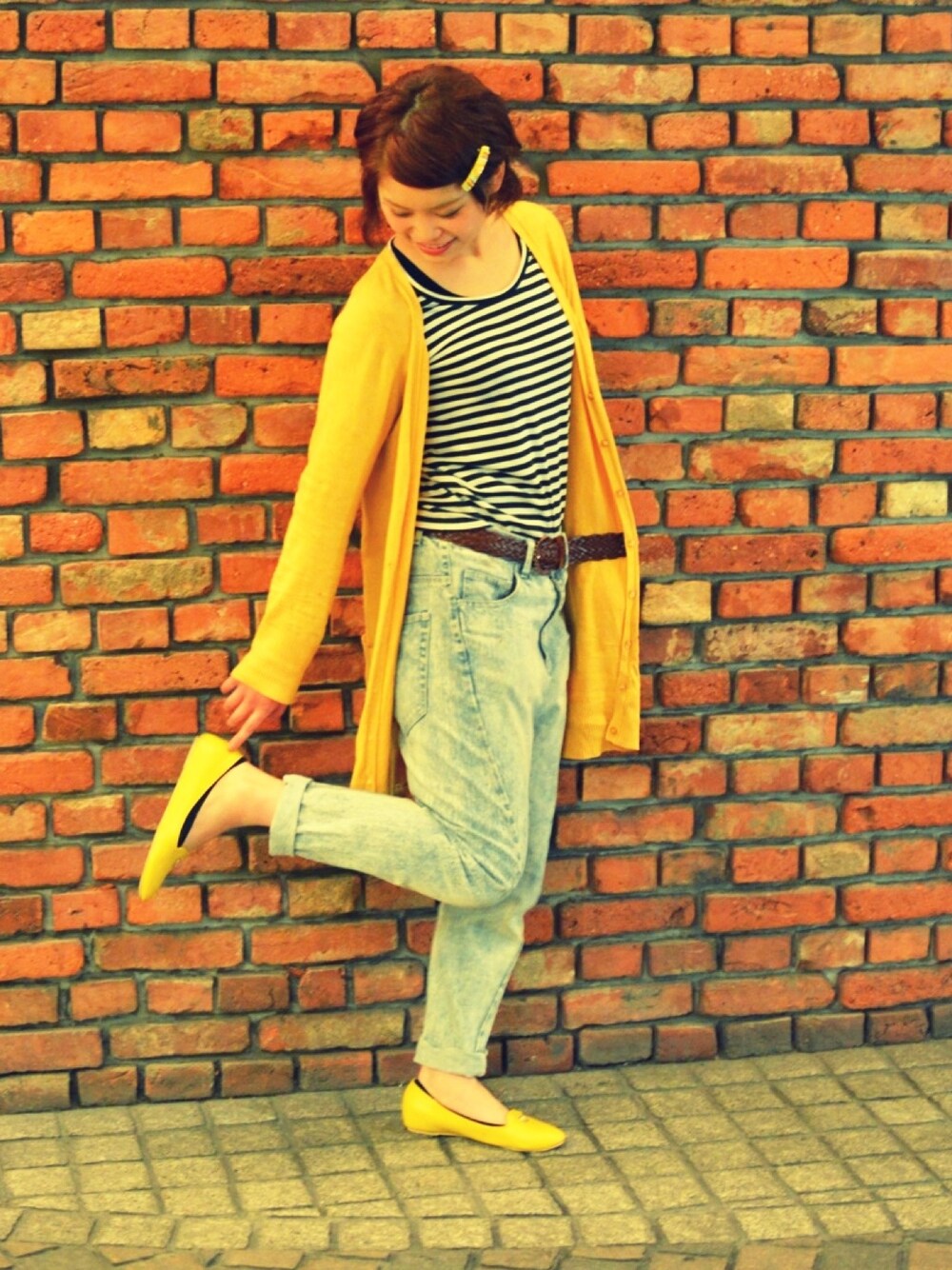 キイロなコーデ(*^^*) キイロだいすき!( ^ω^ ) 気持ちも明るくなれる☆♪ カーディガン/500 インナー/もらいもの デニム/3000 くつ/900 バレッタちゃん/手作り キイロのときはるんるん気分( ^ω^ )♪♪♪