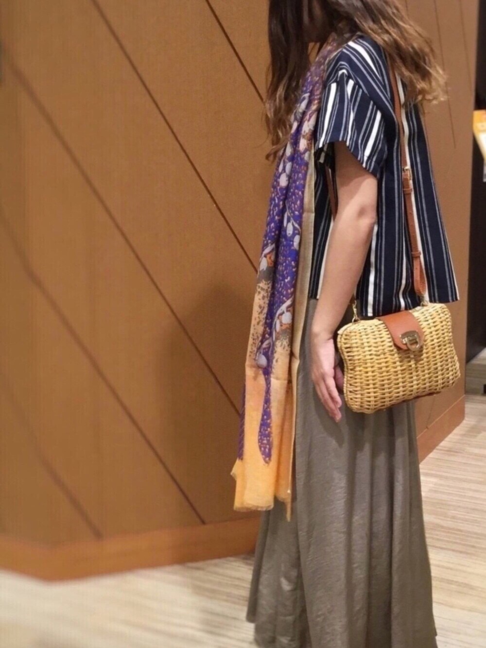 陽射しの強い日はカゴポシェットを持って一気に夏仕様♪ コロンとしたフォルムが魅力的✨ 差し色にストールの鮮やかなオレンジを。