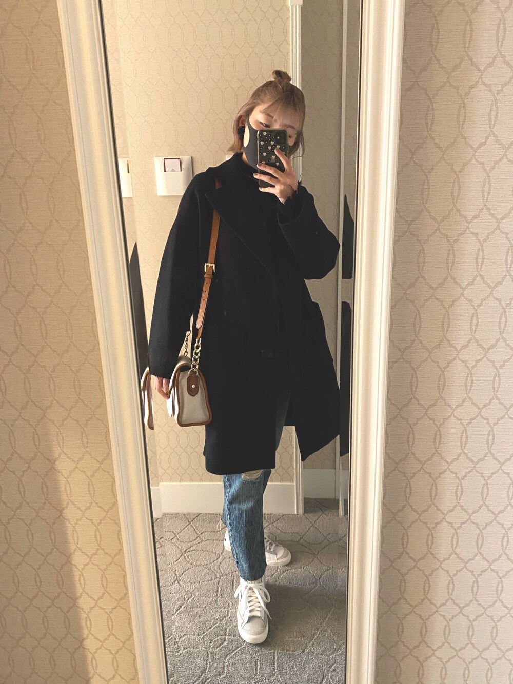 ダメージデニム×ブレーザーで カジュアルにしつつ 上は黒でまとめてみました🖤🤍 コートは友達の😜 最初ライダース着ようとしてたんだけど、 友達がこっちのがいいよって 貸してくれたら、そっちのがよかった😜🤍