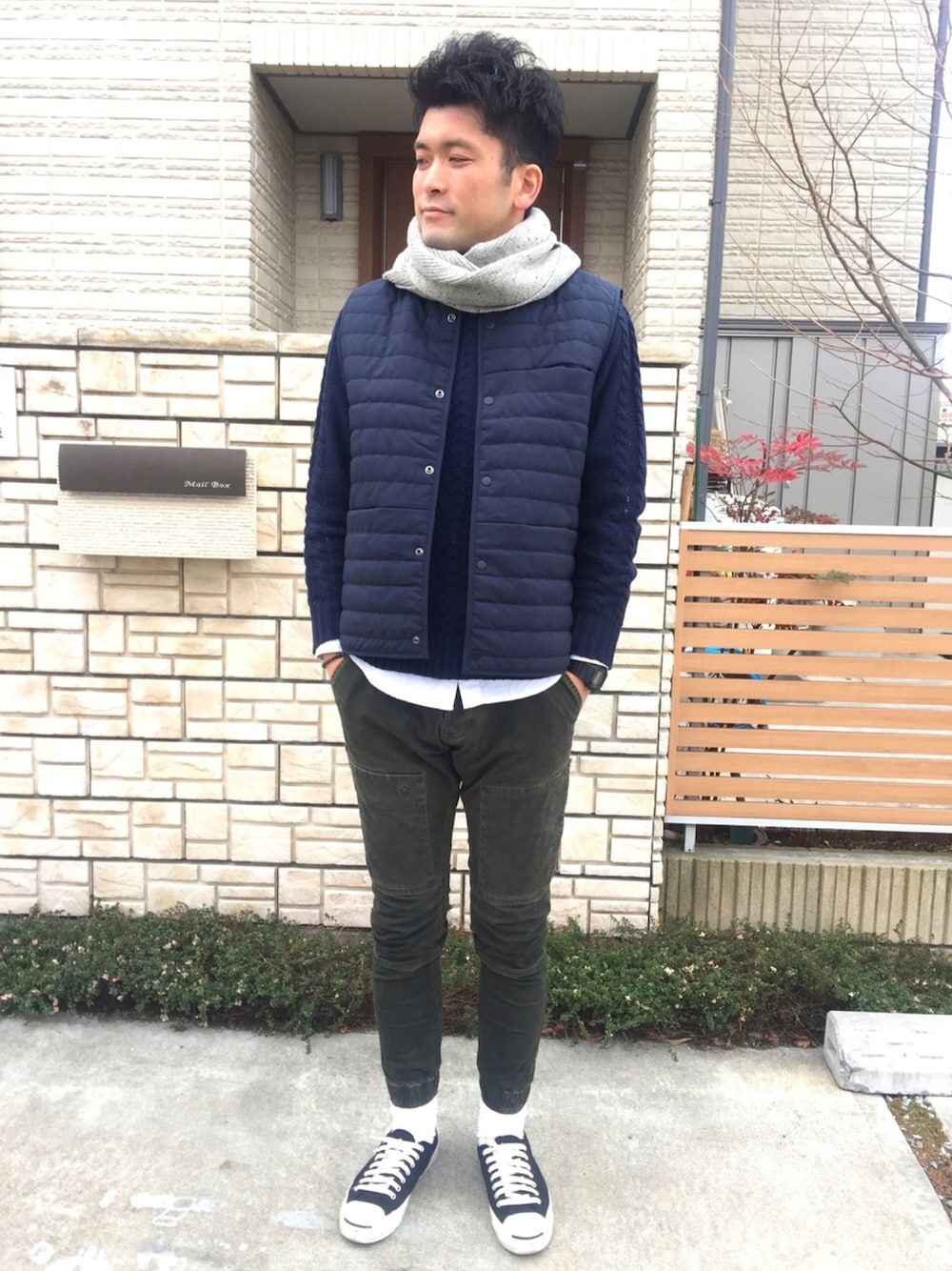 シンプルイズベスト! ということで今回もこりずにベスト着用なわけです笑😃 前と同じになると嫌なので今回はマフリャー着用です。 マフラーもH&Mで700円でした🌅 「こいついっつもH&Mだな」と言われても、いいんです!