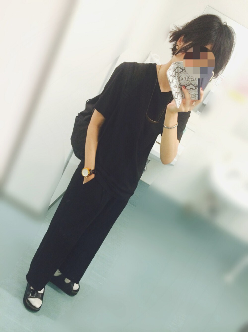 オールブラックコーデ。 アクセサリーは ネックレスとバングルの ヴィンテージゴールドと イヤリングと腕時計の べっこうで 統一感をʕ•̫͡•ʔ 最近ヘビロテしている GUのワイドパンツ、 なんとなんと 値下げして590円くらいだった ツワモノ! 良き。