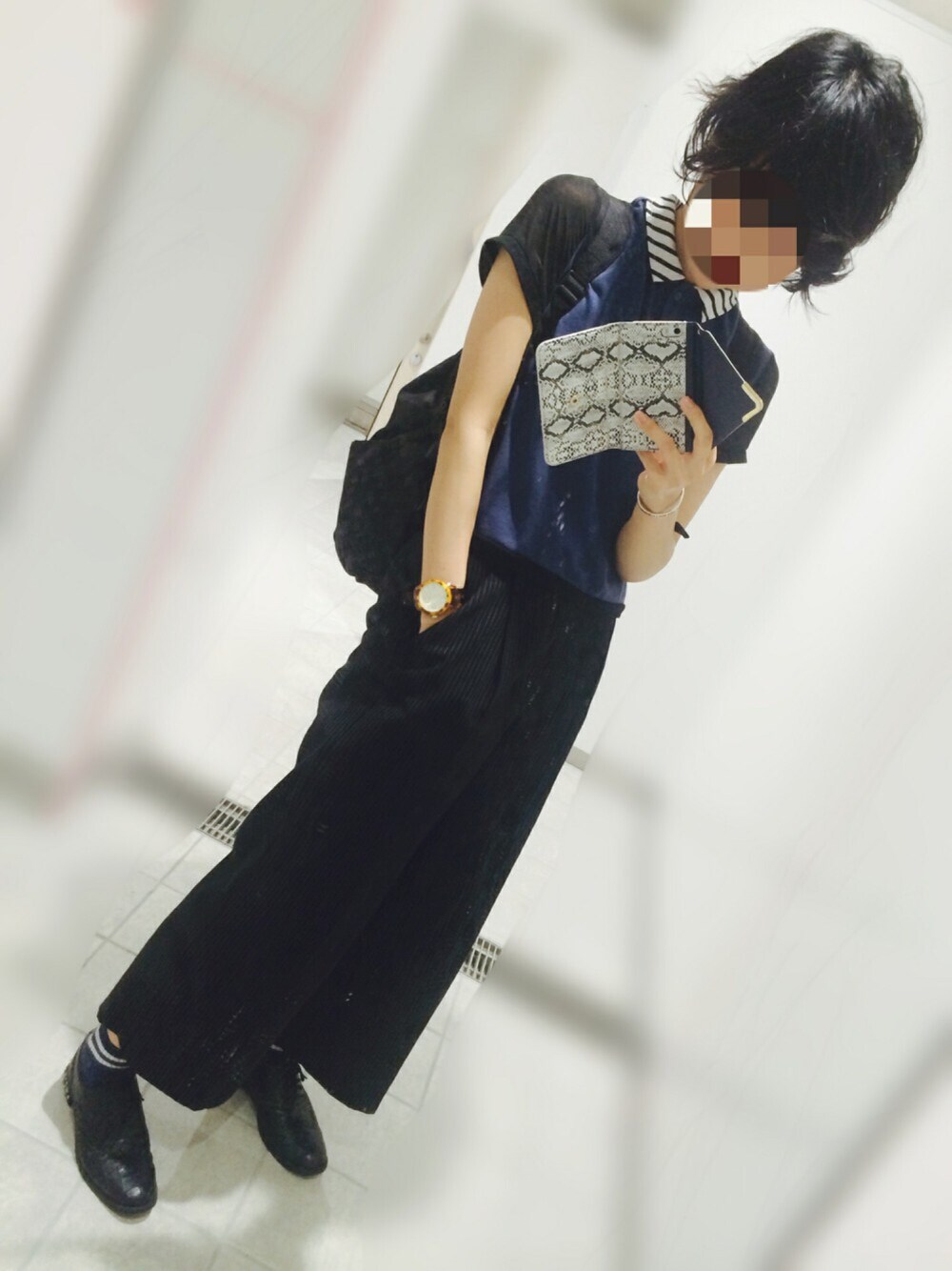 黒×青の キレイめコーデ。 MURUAのポロシャツ、 スクエア型で脚長効果! 袖がトレンドのシースルーで ロートーンでも涼やかに◎ (鏡が汚なくてスミマセン。。。)