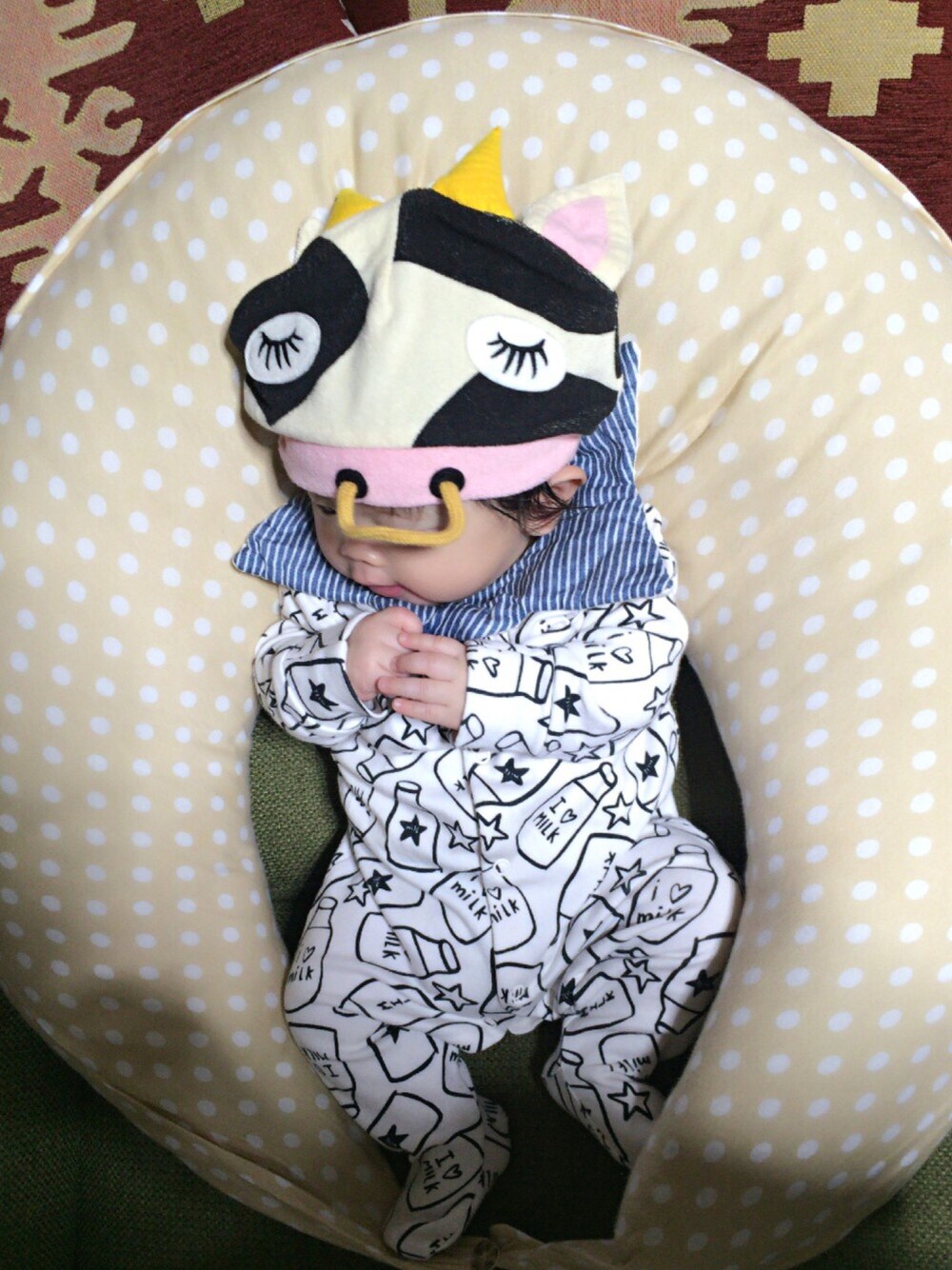 モーモー! 夏用の牛柄ロンパースに合わせるまで寝かせておこうと思った帽子。 あ!でもミルク柄のロンパースあるやん!…てことで我慢できず。