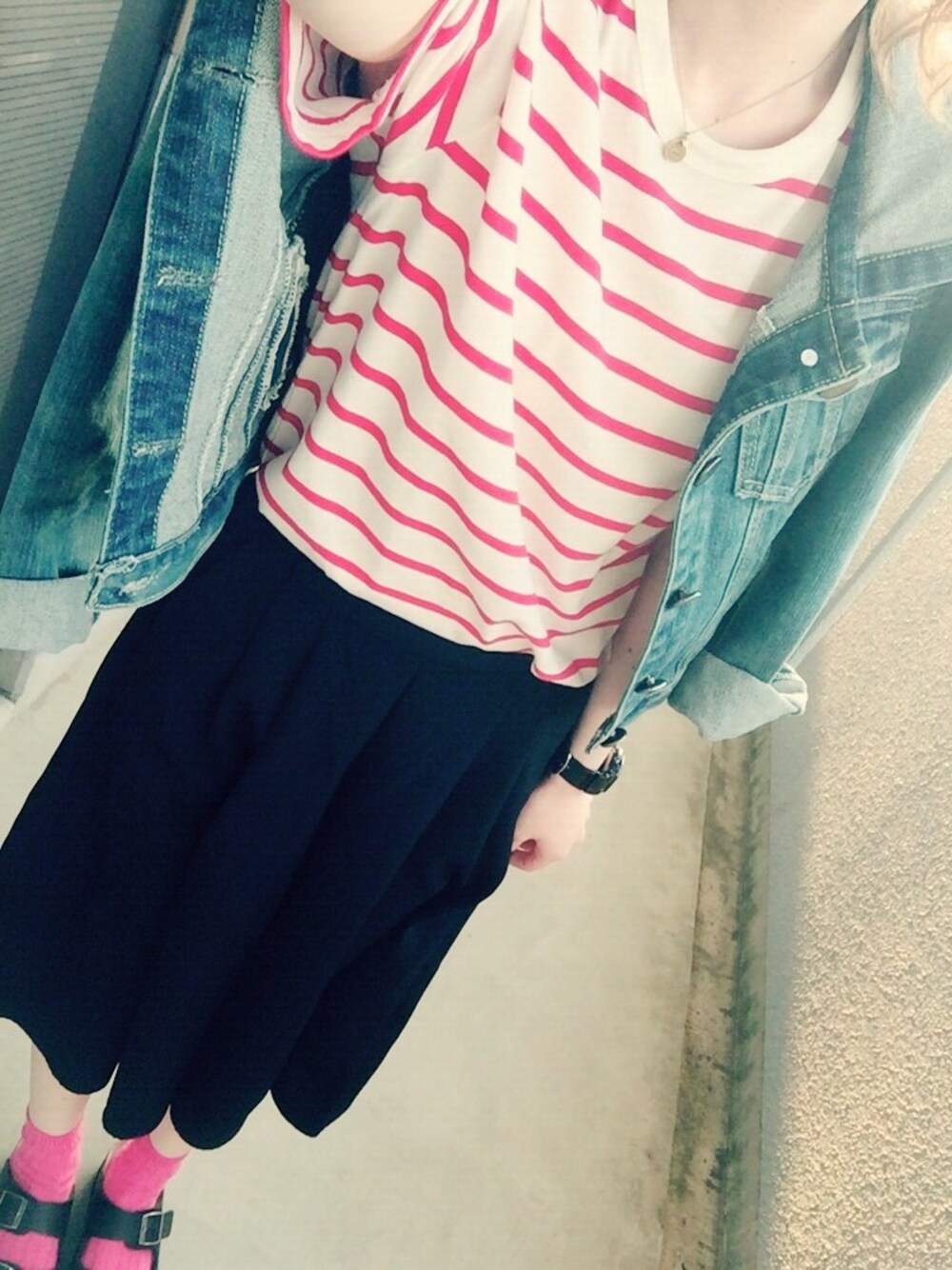 ボーダーTシャツとワイドパンツはGUです^ ^ Tシャツはメンズのものだぜーい⠒̫⃝ 久々に晴れたー!😎☀️ デニムジャケット ▶︎ 古着 Tシャツ ▶︎ GU ワイドパンツ ▶︎ GU 靴下 ▶︎ チュチュアンナ サンダル ▶︎ ABCマート