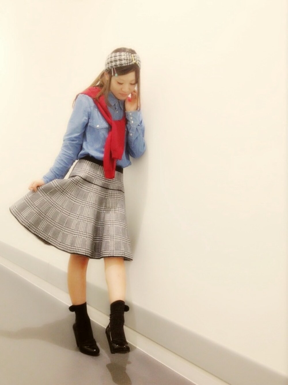 クラシックなグレンチェックのフレアスカートには、ダンガリーシャツでラフに着崩し、差し色で赤! スカートのチェックに合わせてヘアバンドも大きめなハウンドツースで お揃い。 ニットだから、耳もホカホカ♡ shirt▷JOHN LAWRENCE SULLIVAN skirt▷LE CIEL BLEU knit▷無印良品 hairband▷gumit pumps▷ZAHIR