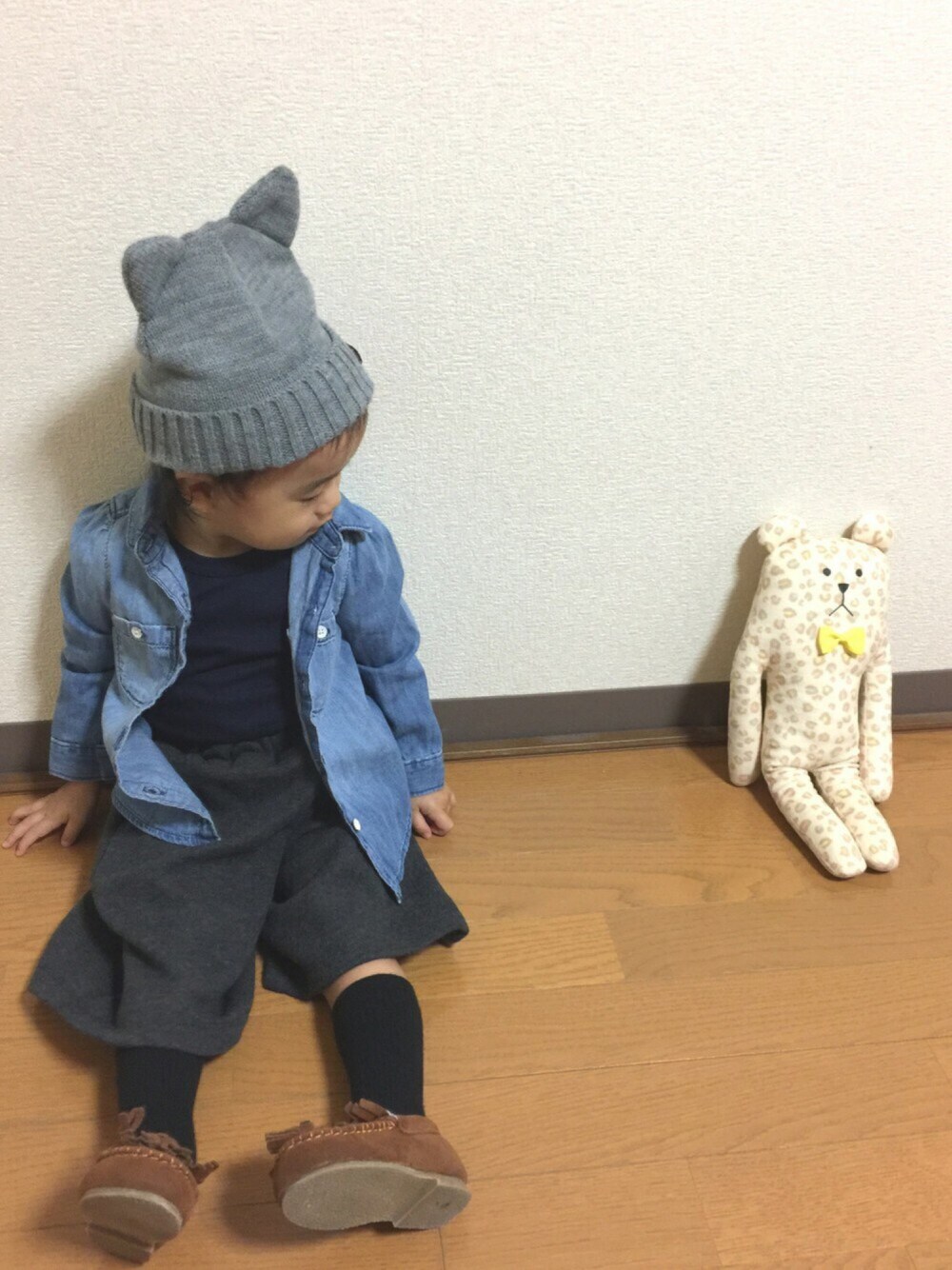 こんにちは〜😊 いいね、SAVE本当にありがとうございます(*^^*) フォローも嬉しいです❤️️ 今日は撮影拒否😭 なので、座らせて我が家のスロース君と一緒に撮ってみました🐻 いつも同じようなコーデになるー😭 髪がなかなか伸びないので帽子は必需品です😅