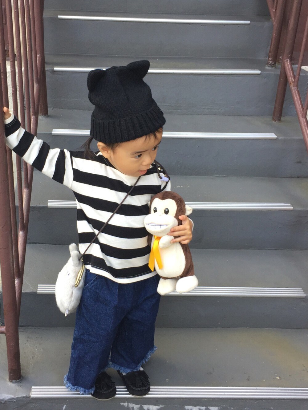 こんにちは〜😊 いつもいいね、SAVEほんまにありがとうございますっ❣️ このプティマインのボーダーカットソー 後ろがレースになってて可愛い😍 レースとかチュールとか普段選ばないから なんか新鮮😚❤️️ 今日もおさるのジャイアンとトトロポーチと一緒にお出かけですー
