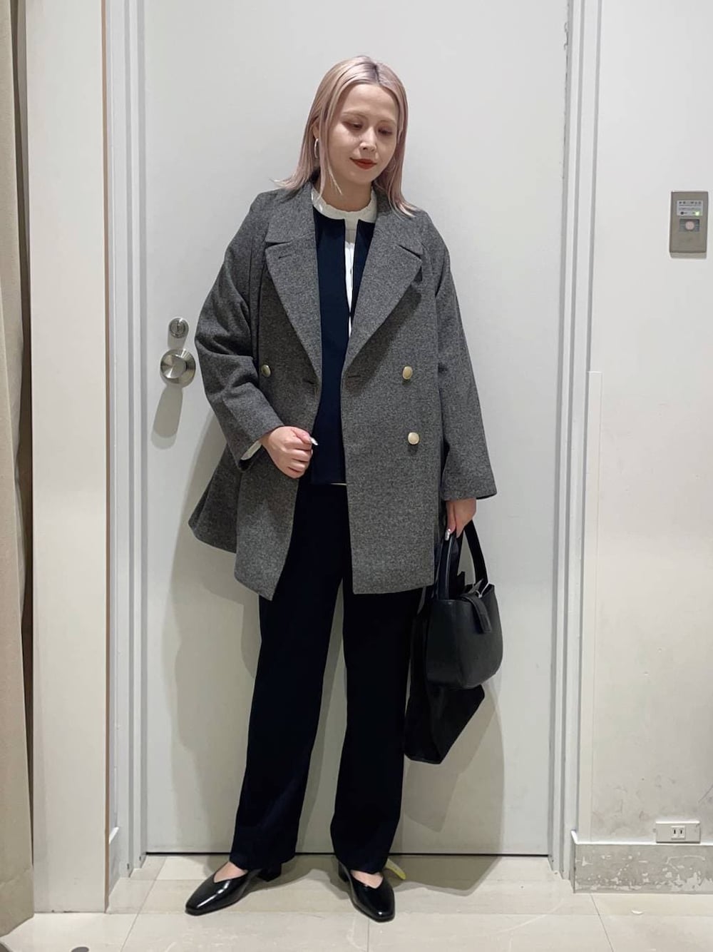まるこ(GLOBAL WORK セブンパークアリオ柏)のチェスターコート「軽やかストレッチ襟2WAYミドルコート/499658」を使ったコーディネート