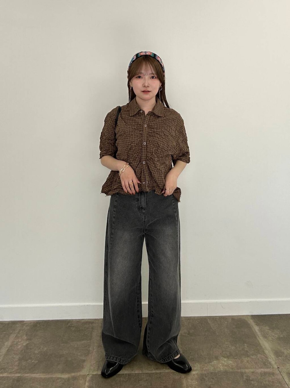 落ち着いたトーンのコーデにクロシェフラワーのヘアバンドでワンポイント! チェックシャツは元々シワ加工が施されているので、一気におしゃれ見えしますし洗濯も気にしなくていいのがうれしいですね😊 デニムは足のラインを拾わないので助かります😢