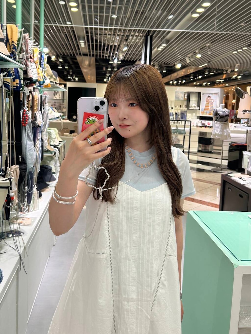 クリアなビーズがかわいいネックレス🧊💕 一見重たそうに見えますが、軽いので長時間つけても肩こりしないです! スマホショルダーは、バングルにもできちゃう優れもの!