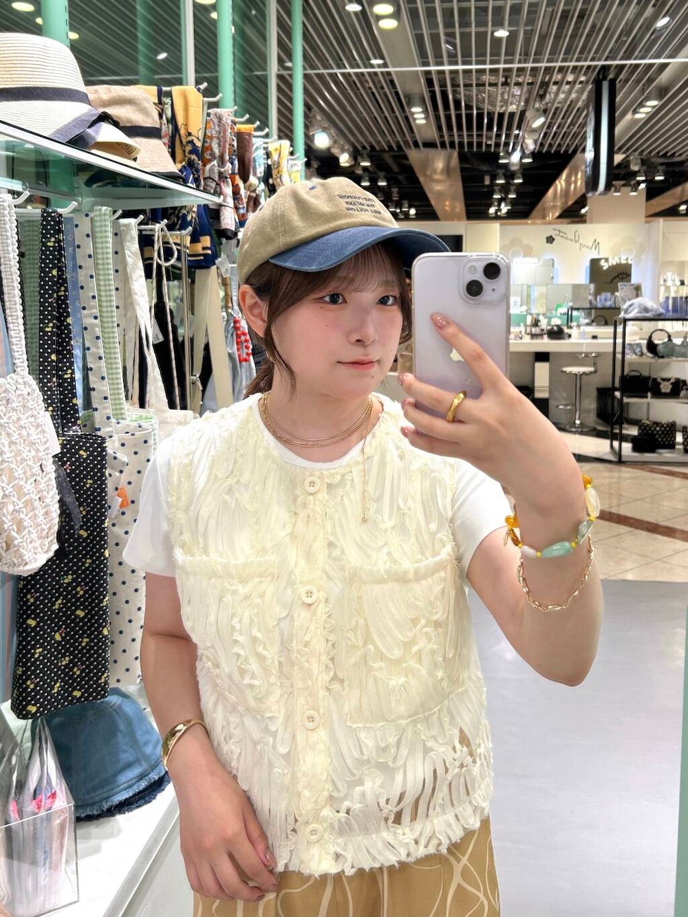 hepでも人気のバイカラーロゴキャップ🧢 洋服が暖色系でまとめていたので、アクセはゴールドで統一しました! 天然石のようなヘアゴムは、ブレスレット感覚でもつけられるのでおすすめです!
