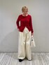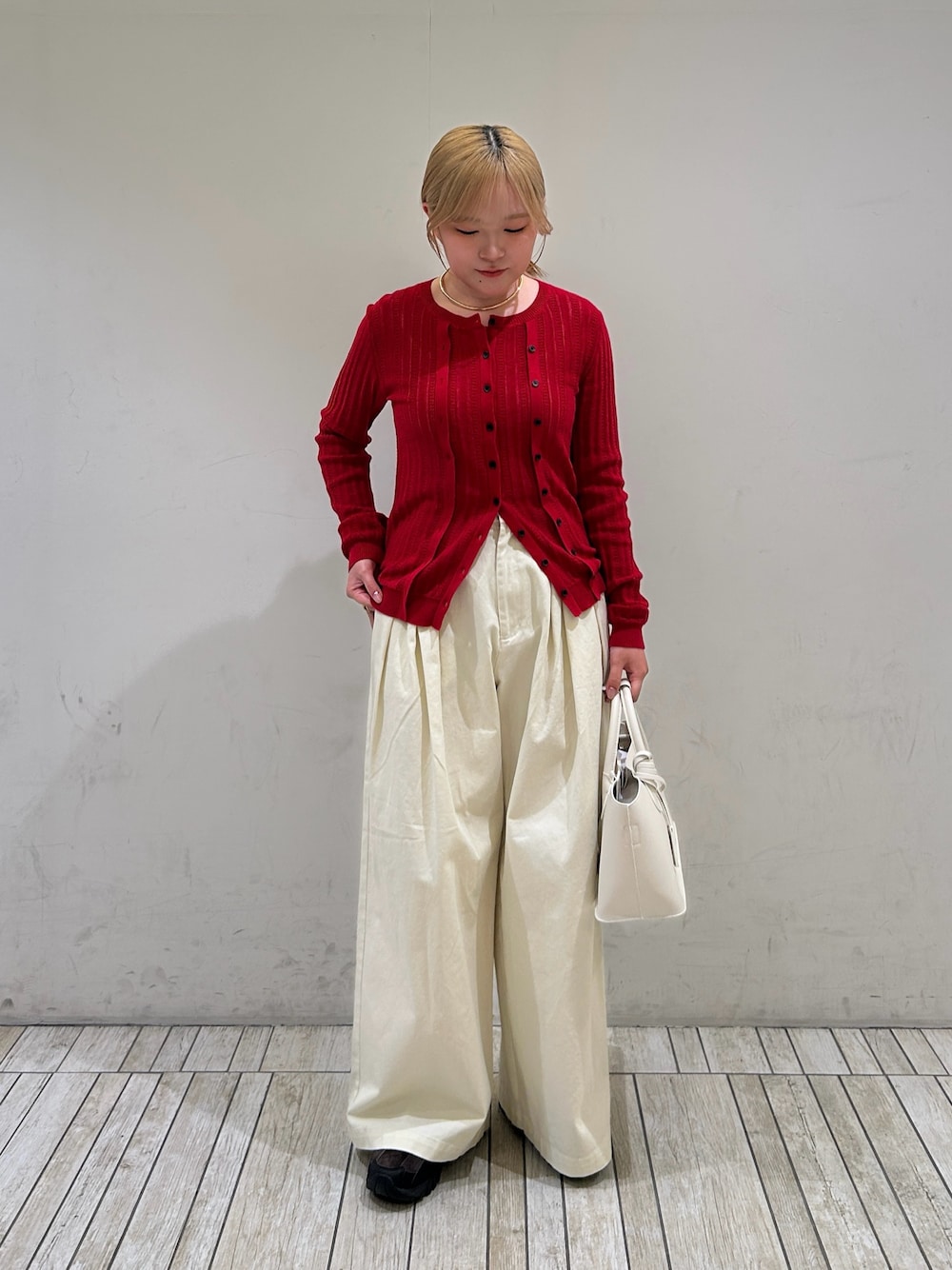 カーディガンのサイズ感は、そこまでピタッとせず体のラインを拾い過ぎないので、体型気にせず着ていただけます! 下のボタンは2.3個開けて、ハイスエストのボトムスと合わせるとスタイルアップします👍