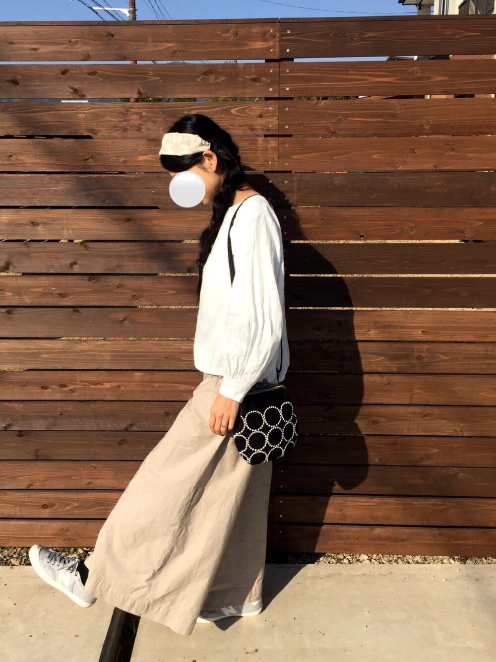 ホワイトコットンリネンのワッシャー加工生地でさらりと着れるバルーン袖のトップスを作りました。 ボトムは薄手のベージュのデニム生地でワイドパンツを作りました。
