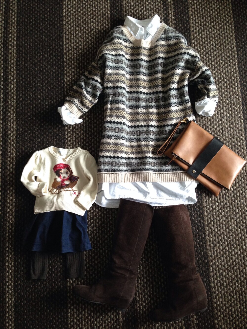 娘 セーター:ラルフローレン スカート:GAP タイツ:西松屋 母 シャツワンピース:無印良品