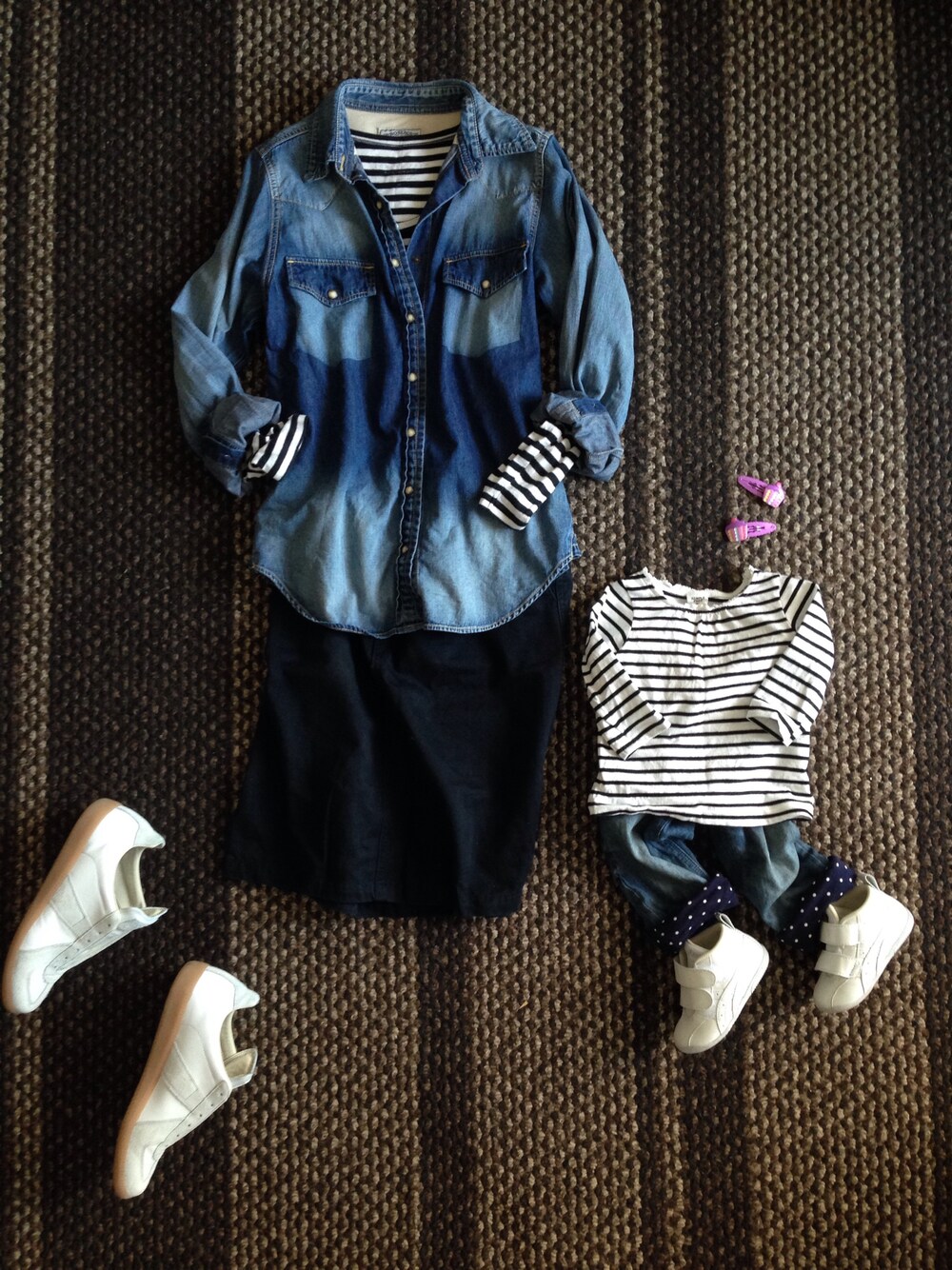 娘 ボーダートップス:アカチャンホンポ デニム:GAP スニーカー:asics ヘアピン:ジンボリー