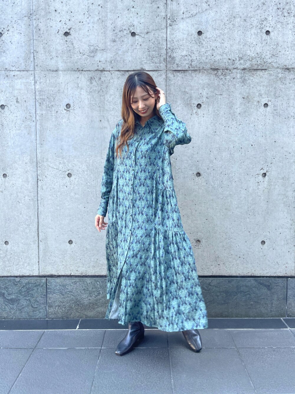 グリーン系のワンピースを着用したレディースの秋コーディネートの1枚目の写真