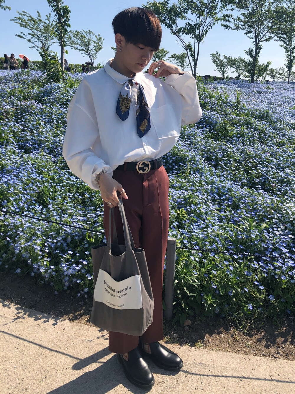 ネモフィラ祭り行ったときの写真です!! メンズですがスカーフ挑戦してみました!KOBE LETTUCEのスカーフです! シャツはshotaさんの袖が絞れるシャツ着てみました! シャツ L パンツ M シューズ42