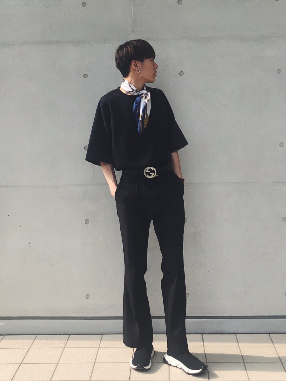 シンプルにオールブラック👍 色味で個性を出さない場合はシルエットで差を付けましょう! メンズスカーフもネイビー系を選んであげると好感度良きです😊 スカーフはkobe lettuceさんの物です! インスタグラムもやったますので是非覗いてください! 👉 @marunongram トップス S パンツ M シューズ 42