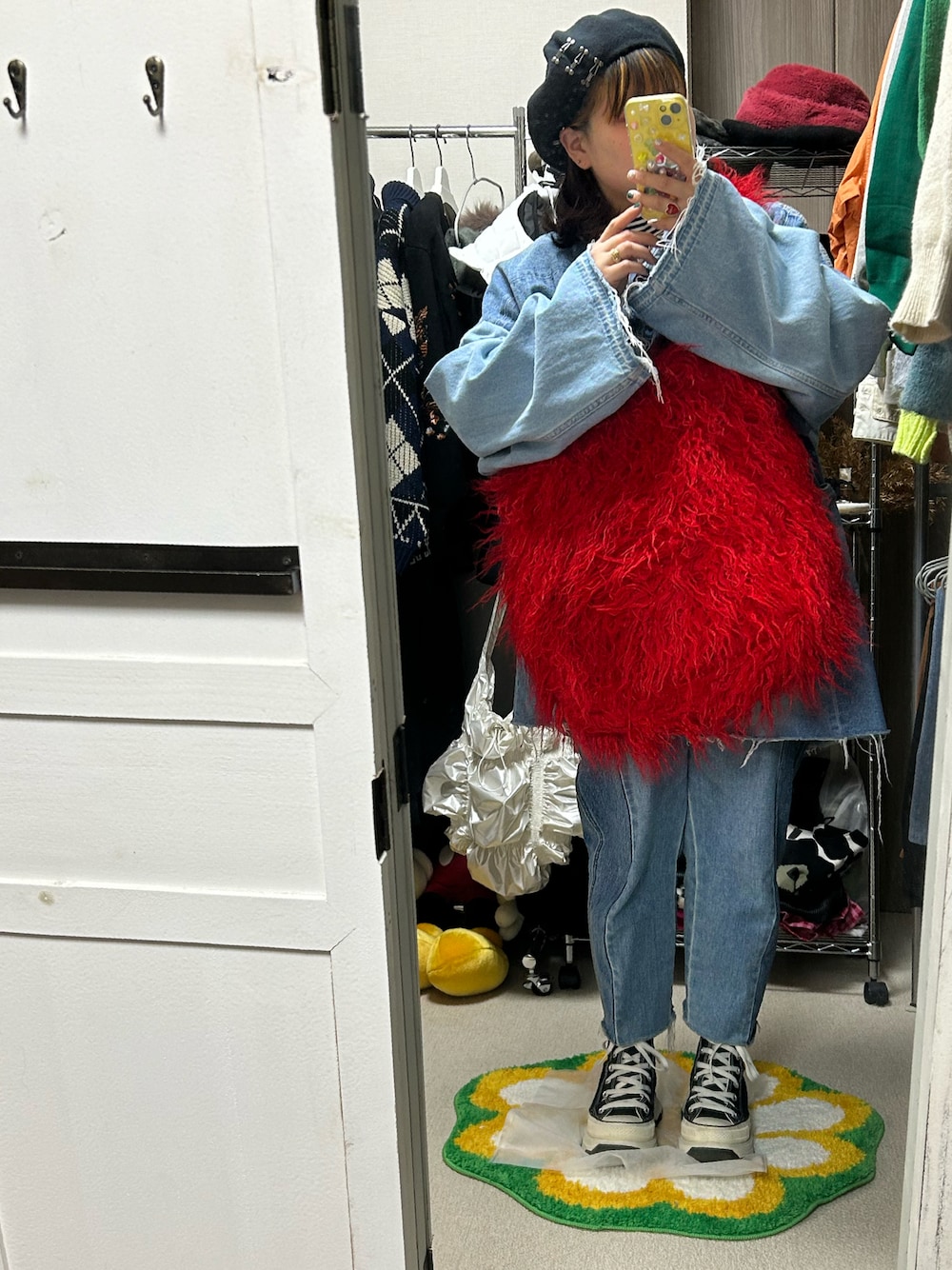 まるみのショルダーバッグ「ファーモンスターバッグ / ショルダーバッグ / A4、PC収納可能」を使ったコーディネート