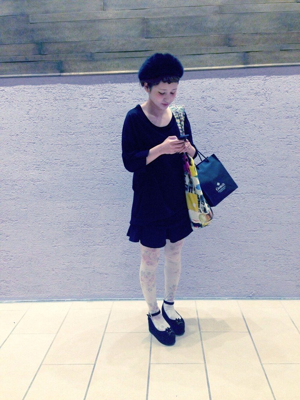 いつかのコーデ 久々真っ黒くろすけ〜 髪の毛は帽子の中全入れで ショート風がハマってる(・ω・) ワンピース★ジーナシス タイツ★グリモ 靴★I am I