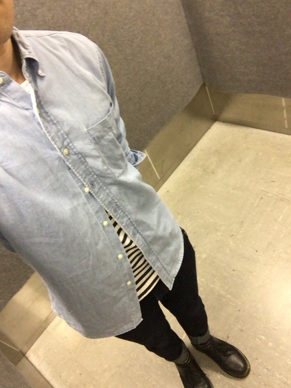 ブルー系のシャツ/ブラウスを着用したメンズの秋コーディネートの1枚目の写真