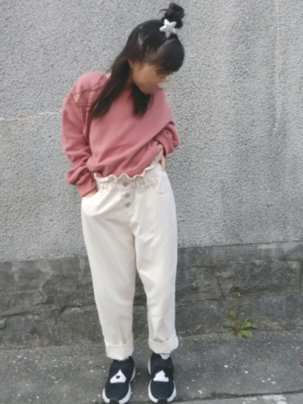 ピンク系のスウェット、ホワイト系のパンツを着用したキッズの冬コーディネートの1枚目の写真