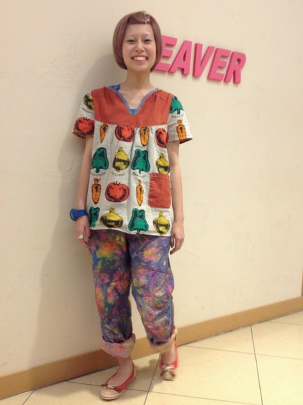 メンズのパンツで太めのシルエットなので、チュニックを合わせることで、女子らしコーディネートになりました。カラフルな格好でテンションをあげます。