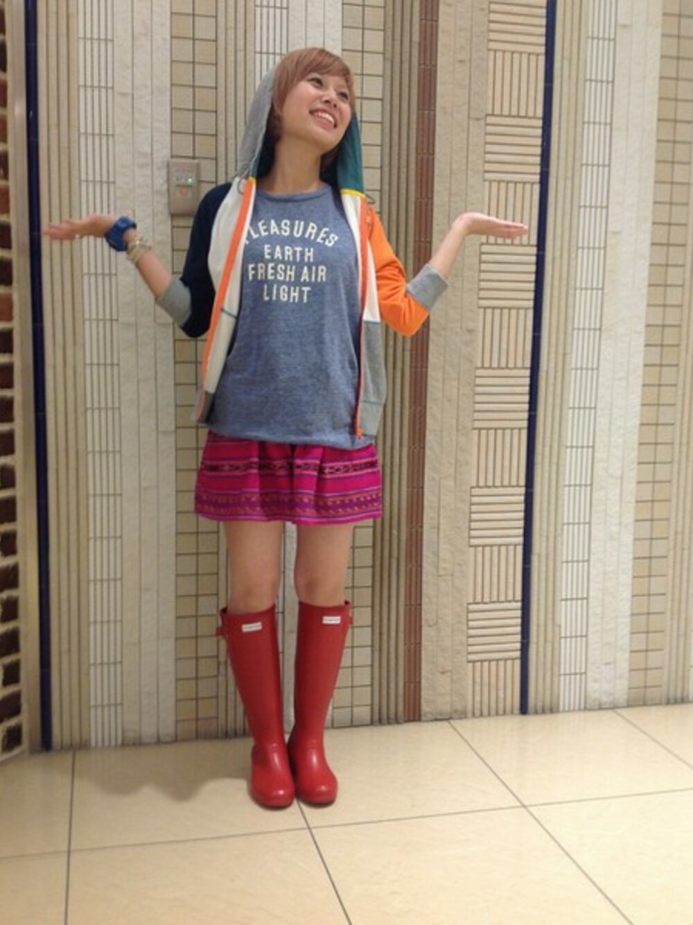 雨の日にオススメコーディネートです。レインブーツにはショートパンツを合わせるのがバランスがいいです。