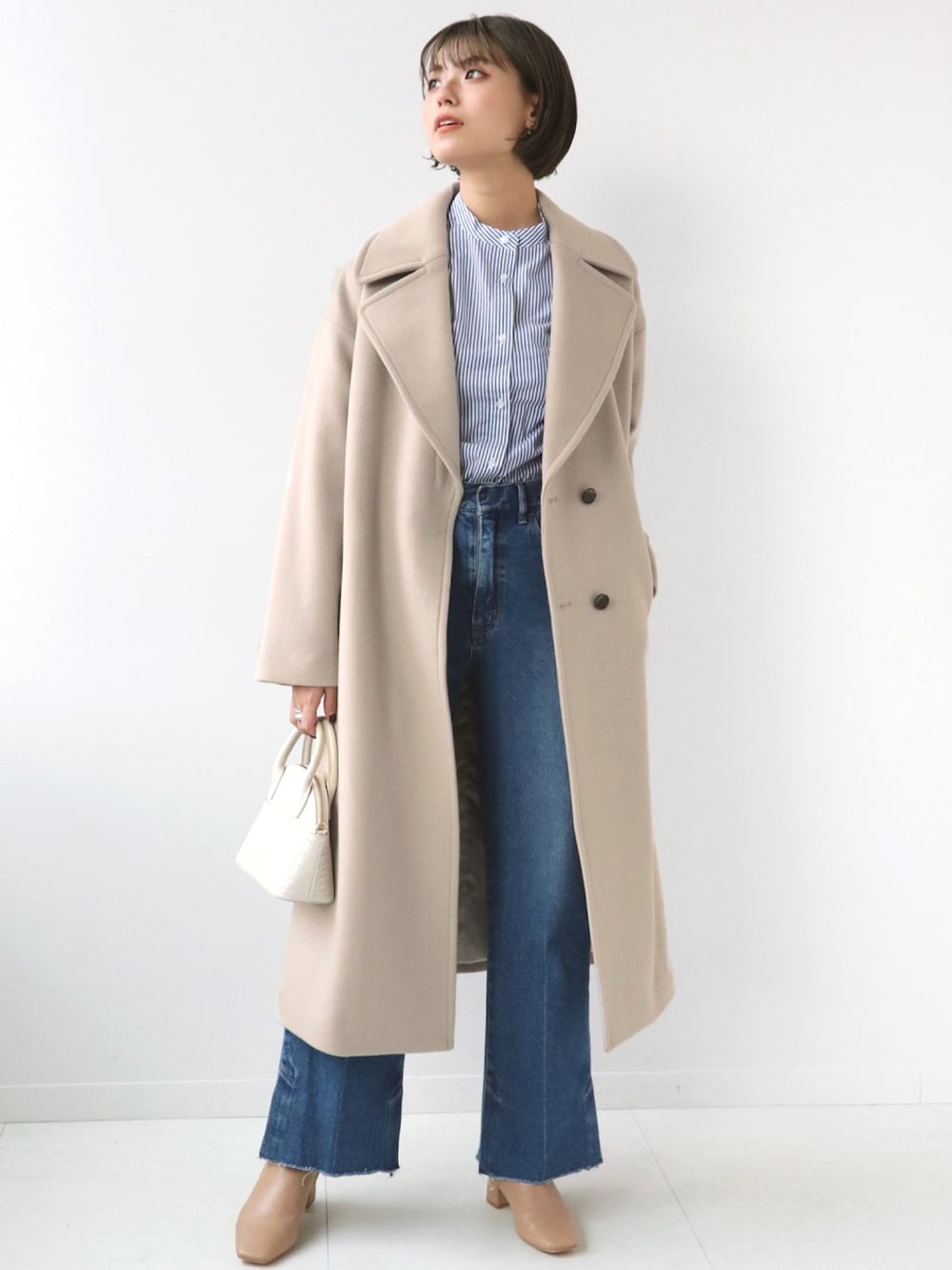 女性らしさを引きだす、ニュアンスベージュ♡ インナーはクリーンなストライプシャツとデニムのコーディネート。 アウターに絶妙なベージュを纏い、女性らしさをプラス◎ 今季イチオシのスタイリングです。 イエベ秋の私にはとてもしっくりくるカラーでした! インナーに暗い色を着ても、このコートを羽織ると顔色がぱっと明るくなります。 【スーパー100Wビーバー ビッグカラーコート】 ----- 着心地 ----- 滑りの良い裏地付きで、着脱のストレスがありません。 しっかりとした生地感ですが、重たさも気になりませんでした。 ----- サイズ感 ----- 肩周りと身幅がゆったりしています。 Iラインのシルエットなので、着ぶくれして見えにくいです。 着丈は、ふくらはぎの中間くらいの長さでした。 *** 着用スタッフ情報 *** 身長:165cm 体型:普通 肌:イエローベース秋 骨格:ストレート 普段サイズ:S~M(36~38) 着用サイズ:フリー