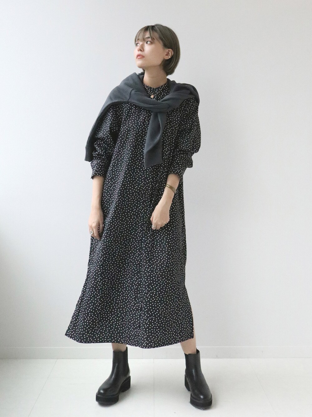 抜け感のあるモノトーンコーディネート。 ドット柄のシャツワンピに、スエットをざっくり肩掛けに。 ワンピースの上からスエットを着ても可愛いです! 全身ブラックの色味は重たくなりやすいですが、柄やロゴを混ぜるとほど良く抜け感が出ます◎ ドットのシャツワンピースは、上にニットを着てスカートのように着用しても可愛いので着回し力抜群! 今季イチオシのアイテムです。 【バンドカラーロング シャツワンピース】 ----- 着心地 ----- ドライ感のあるコットン素材で、シーズンレスで着られそうです。 透け感は気になりませんでしたが、一枚で着るときにはペチコートの着用がおすすめです。 ----- サイズ感 ----- ドロップショルダーのIラインシルエット。 高身長でもゆったりと着られるサイズ感です。 *** 着用スタッフ情報 *** 身長:165cm 体型:普通 肌:イエローベース秋 骨格:ストレート 普段サイズ:S~M(36~38) 着用サイズ:フリーサイズ