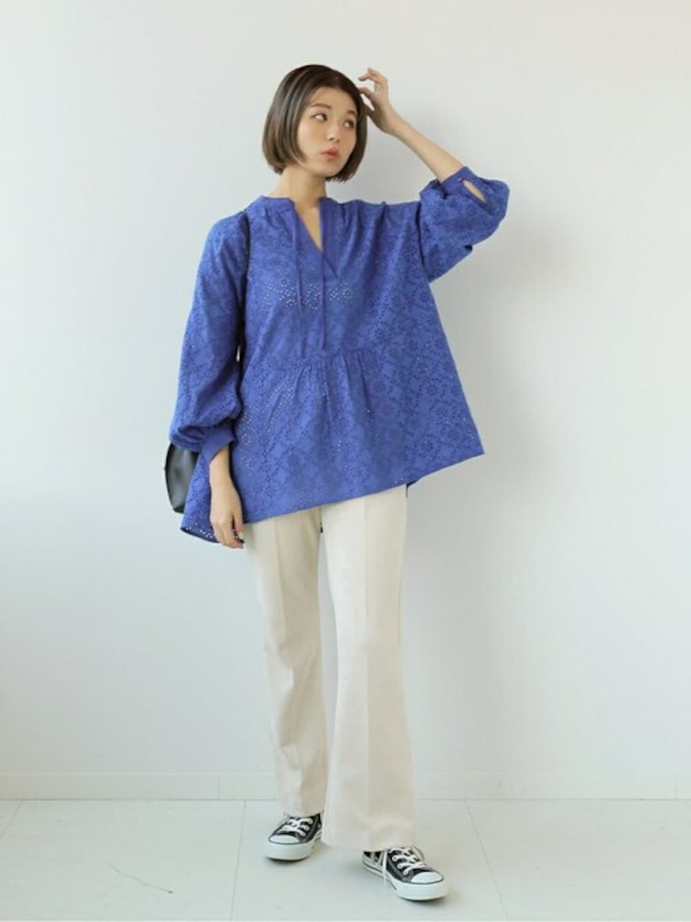 レースブラウスはフレアデニムでちょうどいい甘さに◎ 普段あまり着ないレースのブラウスですが、やや深めのVネックなのでチャレンジしてみました! 上半身〜腰回りにボリュームがある骨格ストレートなので、バランス良くボトムはスッキリしたものを合わせました。 シルエットがとても可愛くてお気に入り♡ ブルーを購入しようか検討中です♪ 【レース刺繍スキッパーブラウス】 ----- 着心地 ----- 程よくハリがあって高見えするレース素材。くたっとしてしまう生地とは違い、シルエットが立体的に保たれます。白はややインナーの色が透けますが露出度は高く見えない生地感で、デイリーに使いやすそうです♪ ----- サイズ感 ----- 全体的にゆとりのあるサイズ感で、腕を上げても突っ張る感じがありませんでした。着丈は腰回りを程よくカバーしますが、ワイドなボトムも合わせやすい絶妙な丈感です◎ 【スリムフレアパンツ】 ----- 着心地 ----- 柔らかく気持の良い素材感。伸縮性があり穿き心地抜群です◎ ----- サイズ感 ----- ウエストはややゆとりがありますが、中肉のニットもインできました。ヒップ周りはちょうどいいフィット感。腰のハリ感を拾いすぎず、スッキリとしたシルエットで穿けました。着丈はやや足の甲にクッションするくらいの理想的な丈感です! *** 着用スタッフ情報 *** 身長:165cm 体型:普通 肌:イエローベース秋 骨格:ストレート 普段サイズ:S~M(36~38) 着用サイズ:パンツ→38 その他→フリーサイズ
