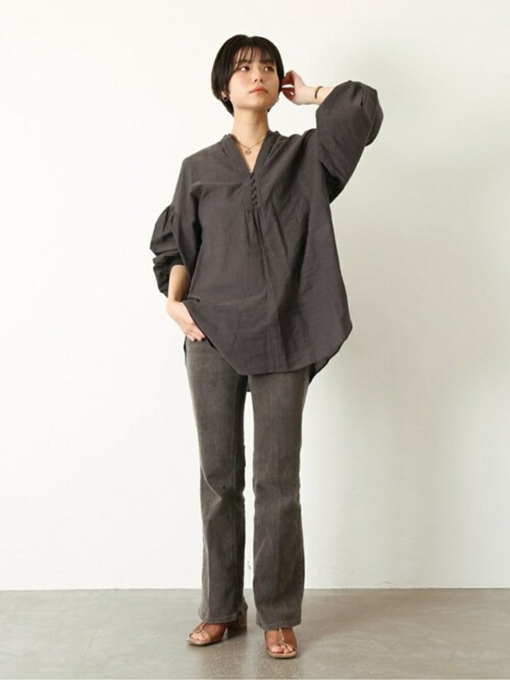 リッチなボリューム感がとっても可愛い一枚♡ 上品なシャンブレー生地を、ラフなスモックブラウスに落とし込んだブラウス。 たっぷりとギャザーの入ったAラインのボディと、ボリュームスリーブのバランス感が絶妙です♪ 上半身ががっちりした体型ですが、スキッパーデザインのネックなので肩周りをスッキリと演出してくれます。 【フロントボタンシャンブレーブラウス】 ----- 着心地 ----- シャンブレー生地ですがバリっとした硬さはなく、軽やかで柔らかい生地感です◎ 腰周りをカバーしてくれる着丈と、ほど良い透け感、ゆとりのあるサイズ感で大満足の着心地の良さです◎キレイめにしたい日も、ラフにしたい日も、デイリーに着られる優秀トップスです。 ----- サイズ感 ----- たっぷりとギャザーの入ったリッチなボリューム感です。肩幅とアームホールも余裕のあるサイズ感なので、幅広い体型の方にお楽しみ頂けます◎ 【SOMETHING/サムシング LISA FLARE】 ----- 着心地 ----- ストレッチが入ったデニム生地なので、動きやすさ、着席時の楽さ、着脱のしやすさを感じました。 長時間でも穿いていられるデニムです。 ----- サイズ感 ----- Sサイズでウエスト周りがちょうど良かったです。 着丈はやや甲にかかる理想的な長さでした。 *** 着用スタッフ情報 *** 身長:165cm 体型:普通 肌:イエローベース秋 骨格:ストレート 普段サイズ:S~M(36~38) 着用サイズ:パンツ→Sサイズ その他→フリーサイズ