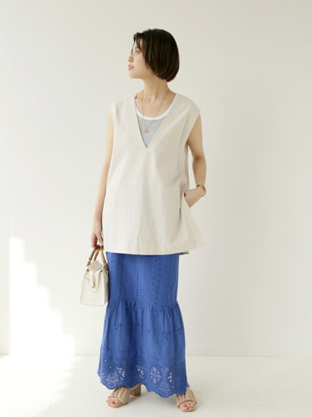 鮮やかなブルーのレーススカートはスタッフにも人気のアイテム。 シンプルなカットソーやシャツと合わせても存在感があり、コーディネートの主役になります♪ 【レースパッチワークティアードスカート】 ----- 着心地 ----- ボリューム感の少ないAラインなので、フレアスカートが苦手な方でも取り入れやすいと思います◎個人差はありますが腰周りが太って見えにくく、ゆったりとしたトップスを合わせても重たくなりにくかったです◎ ----- サイズ感 ----- ウエストは伸び感の良いウエストゴムになっているので、幅広い体型の方にお楽しみ頂けます♪着丈はくるぶしが見えるくらい、中の裏地は膝下の丈でした◎ *** 着用スタッフ情報 *** 身長:165cm 体型:普通 肌:イエローベース秋 骨格:ストレート 普段サイズ:S~M(36~38) 着用サイズ:全てフリーサイズ Instagram:@emimaruyama517